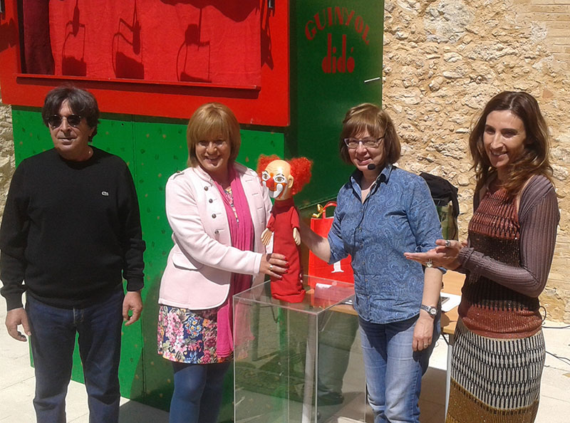 Después del estreno de “Charlie Rivel y el fantasma”, la Sra. Rosa Fonoll, alcaldesa de Cubelles y la Sra. Ester Pérez, concejal de Cultura, reciben el títere donado por la compañía Titelles Guinyol Didó. 29 de abril de 2017