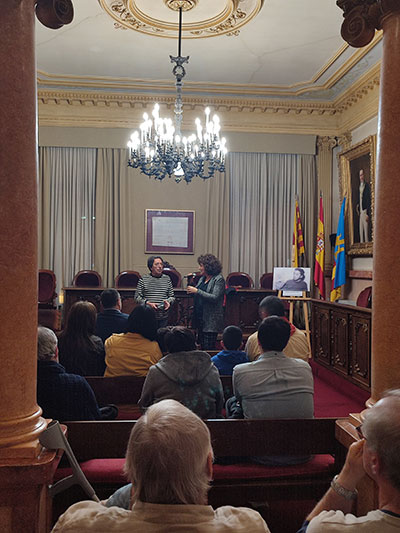 La regidora de cultura, Teresa Llorens, lliura un record de l'ajuntament durant l'acte al saló de plens de de l'Ajuntament de la vila |