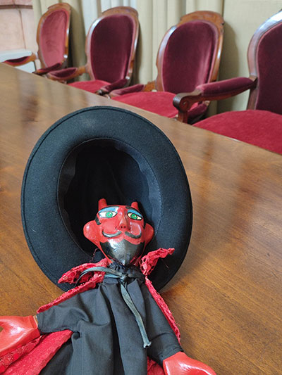 El dimoni i el barret del Ramon descansen a la taula consistorial, un cop acabada l'actuació |