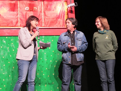 La Sra. Ariadna Llorens s'adreça al Ramon en l'acte de reconeixement organitzat per la regidoria de Cultura de l'Ajuntament de Vilanova i la Geltrú, en ocasió dels seus 60 anys en el món dels titelles. Teatre Principal, 29 de maig de 2016. |